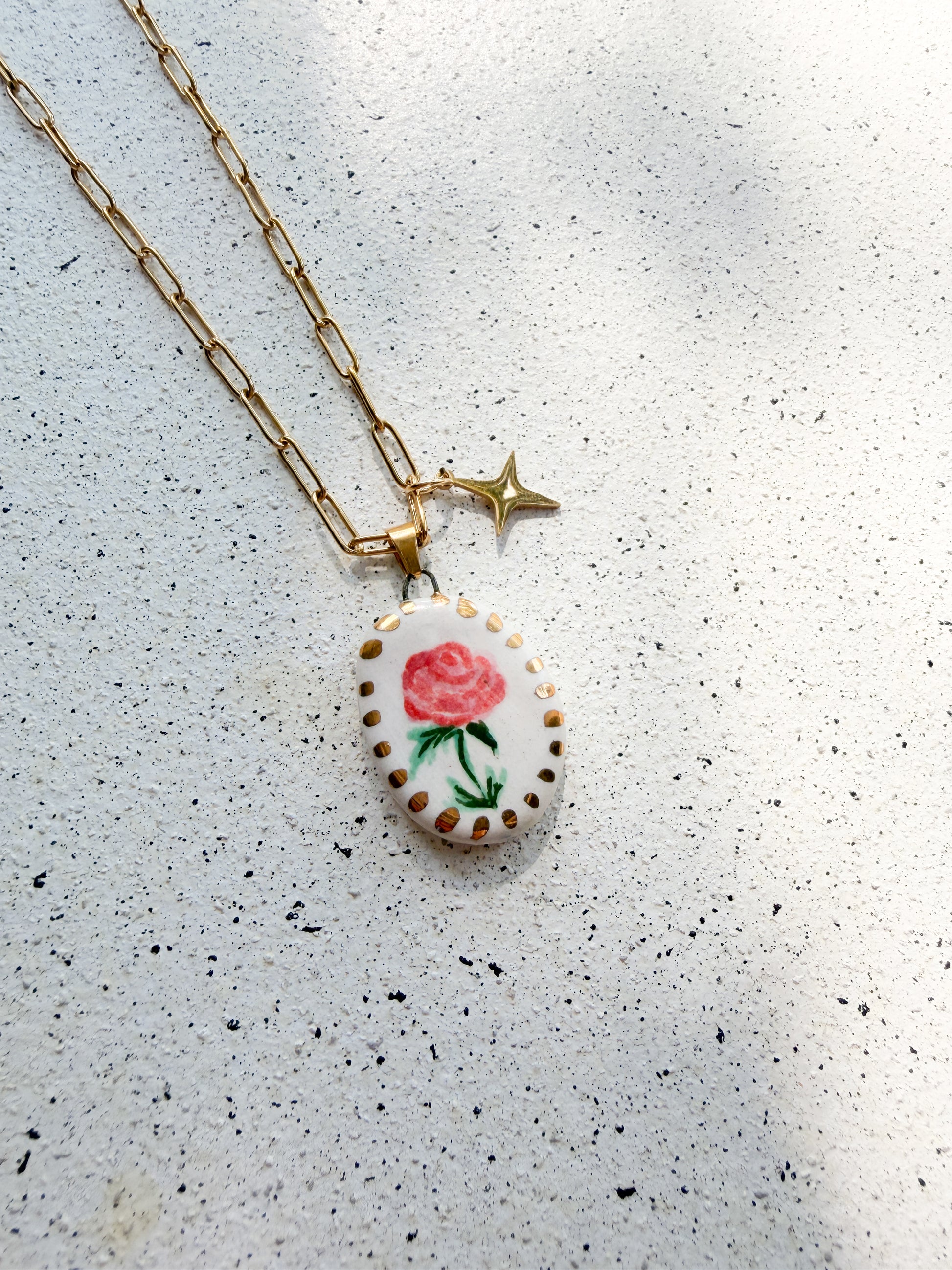 Collar medalla de cerámica modelada y pintada a mano.