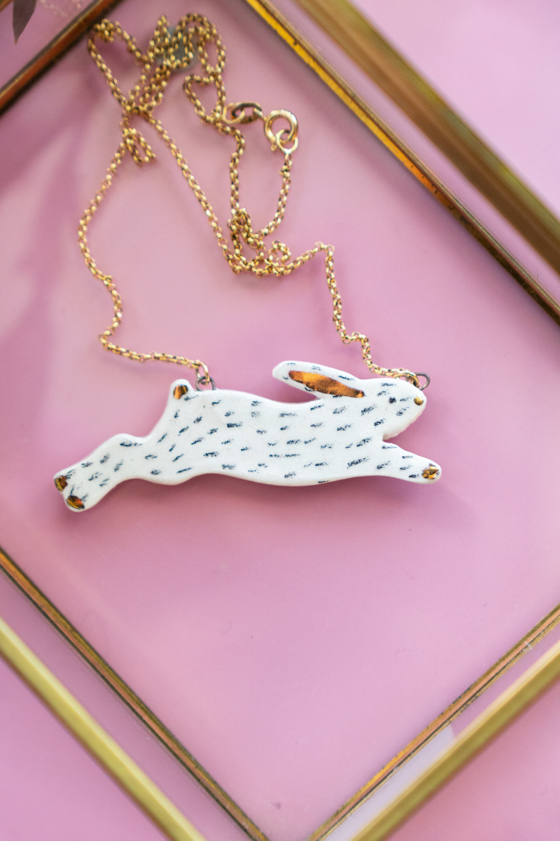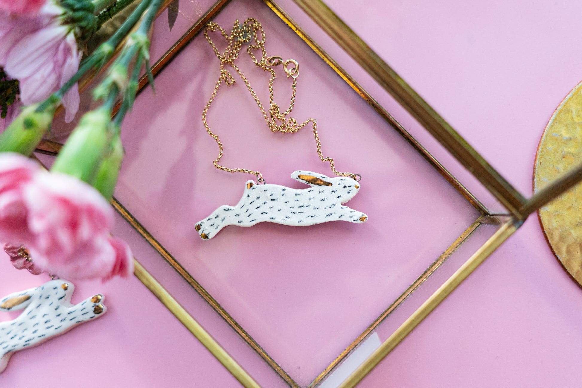 Collar conejo saltando, detalles en oro, cadena chapada en oro 45 cms.