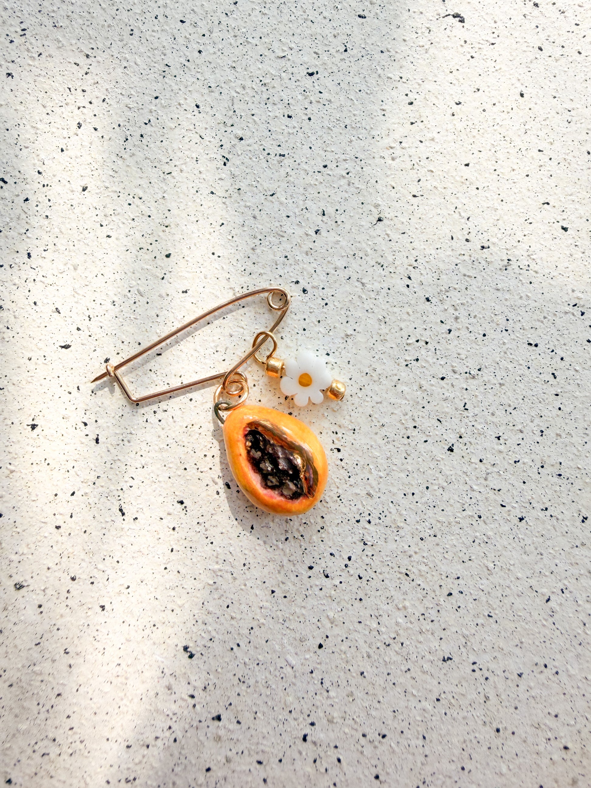 Prendedor de frutita hecha en cerámica, modelada y pintada a mano con detalles en oro.