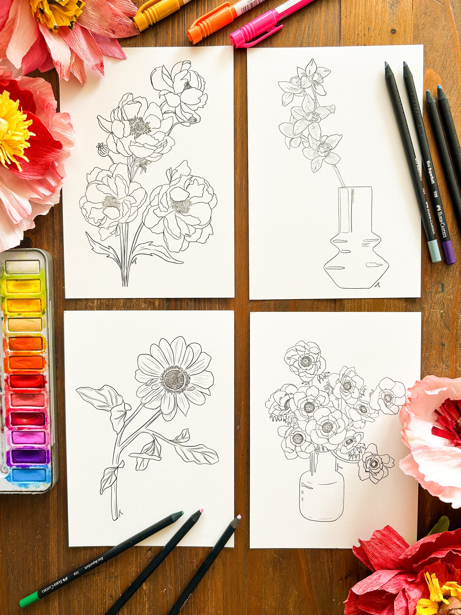 Set de 8 postales, 4 diseños de flores diferentes para colorear.