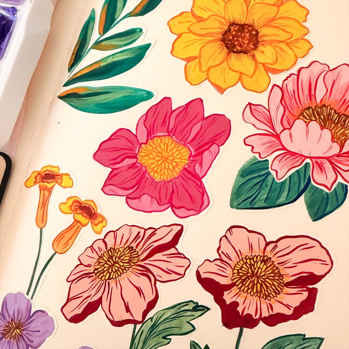 ¡Ademas de usar gouache, usaremos otros tipos de materiales que nos ayudaran a darle mas vida a nuestras obras florales, como lápices de colores, entre otros!